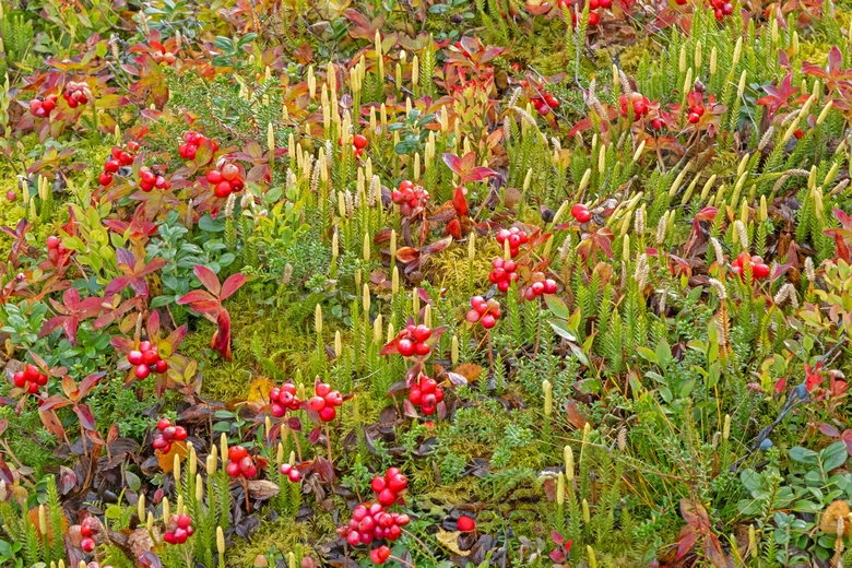 Abfahrt in Aachen Mitte September - Bäume und andere Pflanzen tragen noch ihr grünes Kleid, dank des nicht zu trockenen Sommers. Ein ähnliches Bild findet man auch noch in Südschweden. In Mittelschweden überwiegt bei den Laubbäumen das Gelb von Birken und Espen. Nördlich des Polarkreises kommt zum Gelb der Fjällbirken das Rot-Orange der Zwergbirken, das helle Rot von Rausch- und Heidelbeeren sowie das kräftige Kirschrot bei den Blättern der Bärentraube. Die Früchte der Preißelbeeren erstrahlen ebenfalls in einem leuchtenden Rot - ein schöner Kontrast zu ihren kräftig-grünen Blättern und dem hellen Gelb der Bärlapp-Sporangien. |
